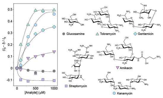 Changes in the fluorescence intensity of the polythiophene-ensemble film with increasing concentrations of glucosamine or aminoglycosides in HEPES buffer solution (100 mM) with TBABr (100 mM) at pH 7.0 and 30 °C.