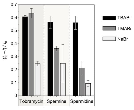 Changes in the fluorescence intensity of the polythiophene-ensemble film as a function of each electrolyte (=TBABr, TMABr, or NaBr; 100 mM). Fluorescent measurements of the film were performed upon the addition of tobramycin, spermine, or spermidine in HEPES buffer solution (100 mM) with electrolyte (100 mM) at pH 7.0 and 30 °C. [Analyte] = 4 mM.
