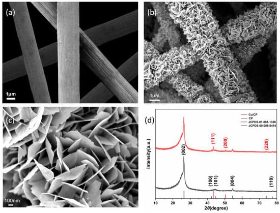 (a) SEM images of CP electrodes at low magnification. (b) SEM images of Cu/CP-sensitive electrodes at low magnification and (c) high magnification. (d) XRD spectra of Cu/CP-sensitive electrodes.