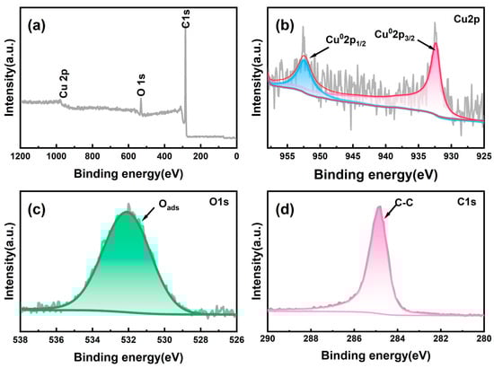 Analysis of the Cu 2p energy spectrum (Figure 3b) unveiled two peaks centered at 932.4 eV and 952.4 eV, corresponding to Cu 2p3/2 and Cu 2p1/2, respectively, signifying the presence of copper in the 0 valence state within the prepared electrodes [24]. Moving on to the O 1s energy spectrum (Figure 3c), the peak located at 532.1 eV was associated with surface adsorbed oxygen (Oads), such as O2−, O−, and -OH groups [15]. These results align with the XRD outcomes, further validating the successful fabrication of the self-supported Cu/CP-sensitive electrodes.