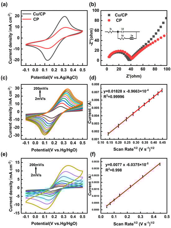 (a) CV curve and (b) EIS spectra of Cu/CP − electrodes in 0.1 M KCl solution containing 5.0 mM [Fe(CN)6]3−/4−. (c) CV curves of Cu/CP electrodes in 0.1 M KCl solution containing 5.0 mM [Fe(CN)6]3−/4− at different scan rates (20, 40, 60, 80, 100, 120, 140, 160, 180, 200 mVs−1). (d) Linear relationship between the peak oxidation current of the Cu/CP electrodes and the square root of the scan rate. (e) CV curves of bare CP electrodes in 0.1 M KCl solution containing 5.0 mM [Fe(CN)6]3−/4− at different scan rates (2, 5, 10, 20, 50, 100, 200 mVs−1). (f) Linear relationship between oxidation peak current and square root of scan rate for bare CP electrodes.
