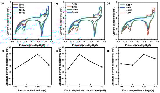 (a) CV curves of Cu/CP−sensitive electrodes prepared at different electrodeposition times with 1 mM nitrite added to 0.1 M KOH electrolyte. (b) CV curves of Cu/CP-sensitive electrodes prepared under different electrodeposition concentrations with the addition of 1 mM nitrite in 0.1 M KOH electrolyte. (c) CV curves of Cu/CP-sensitive electrodes prepared at different electrodeposition potentials with the addition of 1 mM nitrite in 0.1 M KOH electrolyte. (d) Comparative line graphs of reduced peak currents of CV curves of Cu/CP-sensitive electrodes prepared at different deposition times. (e) Comparison of the CV curves of Cu/CP-sensitive electrodes prepared at different electrodeposition concentrations in terms of the reduced peak currents of the line graphs. (f) Comparison of the CV curves of the Cu/CP-sensitive electrodes prepared at different electrodeposition potentials with the reduction peak current fold plot.