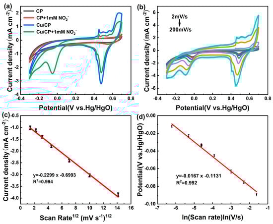 (a) CV curves of bare CP and Cu/CP−sensitive electrodes before and after addition of 1 mM nitrite in 0.1 M KOH electrolyte with a scan rate of 50 mVs−1. (b) CV curves of Cu/CP-sensitive electrodes in 0.1 M KOH solution containing 1 mM nitrite at different scan rates (2, 5, 10, 20, 50, 100, 200 mVs−1). (c) Linear relationship between reduction peak current and square root of scan rate. (d) Linear relationship between reduction peak potential and logarithm of scan rate.