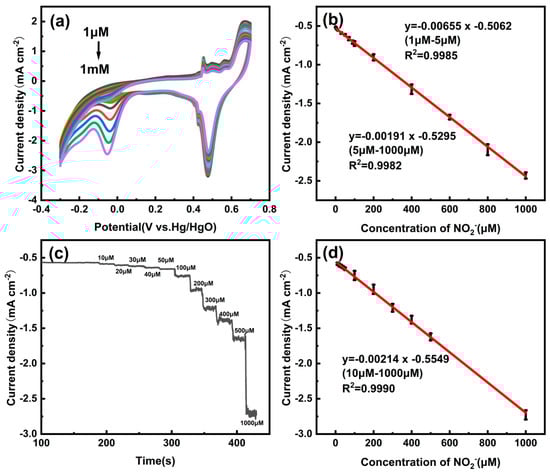 (a) CV curves of Cu/CP−sensitive electrodes in 0.1 M KOH electrolyte at a scan rate of 50 mVs−1 with different concentrations (1, 2, 3, 4, 5, 10, 20, 50, 100, 200, 400, 600, 800, 1000 μM) of nitrite added. (b) Linear relationship between reduction peak current and nitrite concentration. (c) Amperometric response of Cu/CP-sensitive electrodes to nitrite in 0.1 M KOH electrolyte at −0.05 V (vs. Hg/HgO) (d) Corresponding linear relationship between nitrite concentration and current response.