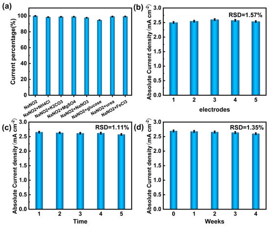 To assess the Cu/CP-sensitive electrode’s resilience to environmental complexity, its immunity to interference was scrutinized. Various interfering ions (NH4+, K+, Mg2+, Fe3+, SO42−, CO32−, Cl−, NO3−, urea, and glucose) at a concentration of 1 mM were introduced into a 0.1 M KOH electrolyte containing 1 mM nitrite. The selectivity and interference immunity of the Cu/CP electrodes were evaluated, with results depicted in Figure 8a. Notably, the current percentage histogram illustrated a minimal impact of the interfering ions on nitrite detection by the electrode, affirming the Cu/CP-sensitive electrode’s robust anti-interference performance.