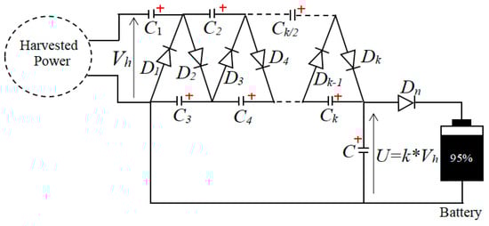 The EMEH is made of a coil-magnet. It collects vibration energy from daily human activities such as walking, running, and jumping to generate electricity. Neodymium magnets are chosen for their high magnetic strength, versatility, and compact size, which make them suitable solution for applications requiring a strong magnetic field [22]. The EMEH consists of two end magnets and a middle magnet with each pole facing the opposite pole of each end magnet. The coil is wrapped around a cylindrical tube inside, to which the magnets are aligned. The harvester is attached to the lower extremity of the body or arms. Human motion induces the displacement of the central magnet of the harvester, which causes changes in the magnetic flux around the coil and generates electricity based on the principle of electromagnetic induction. The voltage multiplier and rectifier in (Figure 2) is made of ultra-low power electronic switches and electrolytic capacitors. It is designed to get a multiplier ratio k = 16. It is used for rectifying the power from the harvester and adapting the harvested voltage to the battery voltage for charging. Both first switches and with capacitor , form the first Schenkel doubler [23], which charges the capacitor at a maximum value of 2 × and , with capacitor form the second doubler, charging the capacitor at a maximum value of 4 × . and with capacitor form the last doubler, charging the capacitor at a maximum value of . The capacitor is used for filtering the multiplied voltage, and the voltage across the capacitor is used for charging the battery. The switch limits reverse current from battery. The harvested power is used for charging the battery of the wearable device and improves the monitoring time.