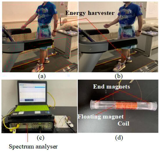 The measurement process of the voltage produced by the harvester, with the harvester attached to the arm (a) or lower extremity (b). The spectrum analyzer (c) and Harvester (d).