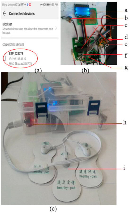 Experimental setup: using the mobile phone as Wi-Fi hotspot for connecting experimental setup (a); experimental setup connected to Wi-Fi (b). a: Screen; b: adjust contrast for screen; c: microcontroller; d: Wi-Fi serial transceiver; e: reset switch; f: pins for ECG sensor; g: power pins for harvester; (c) h: ECG sensor; i: ECG electrodes.