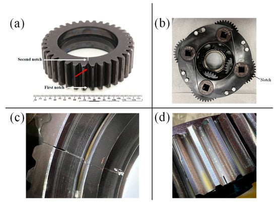 The gear fault. (a) The location of the notches and the propagation path (marked in red arrow), (b) the location of the gear and the notch, (c) a side picture of the notch, (d) the propagation path of the fault.