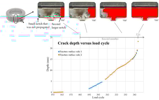 The cracked planet gear, depicted in Figure 2, exhibits two notches, one on each side. Initially, the first (smaller) notch did not result in crack initiation during the first 146 load cycles. Consequently, the gearbox was disassembled, and a second (larger) notch was introduced on the opposite side. This alteration successfully led to the initiation and propagation of a fatigue crack from the second notch, spanning load cycles 147 to 241. Figure 3 illustrates the fault propagation throughout the experiment.