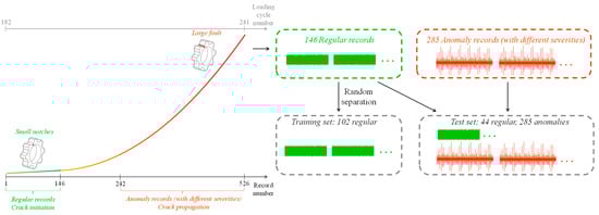 To examine anomaly detection algorithms, it is recommended to divide the benchmark into two categories based on the fractography analysis: regular data from 1 to 146 of crack initiation, and anomaly data from 242 to 526 of crack propagation as presented in Figure 5. This separation helps significantly reduce the error in severity estimation and allows for the assumption that the anomaly dataset represents a significantly different health condition. One advantage of this dataset is the availability of crack propagation estimation, thus the test–training separation strongly relates to the real health of the rotating component.