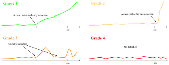 The four optional grades: (1) a clear, stable, and early detection; (2) a clear and stable detection but at a very late stage; (3) unstable detection; and (4) no detection.