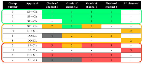 Separation of the 11 participating groups that granted permission to upload their summary files of the HUMS 2023 data challenge based on their performance into three categories: (1) groups with good results on most of the channels (green); (2) groups with mediocre results (orange); and groups with poor results (red). The grades of 1–4 for each channel are explained in Figure 6.