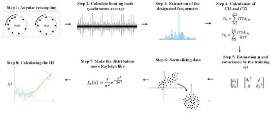 - The health indicator (HI) is calculated by the magnitude of the processed features, i.e., , where and are the processed condition indicators after Steps 6 and 7.