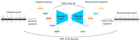 The AE was trained on all the segments of the records in the training set. For example, if there are 1000 records in the training set and each record is divided into 17 segments, the training set size for the AE would be 17,000. The algorithm is illustrated in Figure 9. A higher MSE between the tested record and the reconstruction error indicates a fault because the AE is unable to effectively reconstruct new examples that deviate from the original healthy distribution.