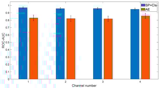 Each algorithm was tested on all four channels, with 100 repetitions of randomly splitting the healthy examples into training and test sets (the indices of the random separation can be found in Ref. []). The results are presented in Figure 10. As observed from the figure, in all cases, the traditional algorithm outperforms the standard, well-known deep learning approach that typically yields good results. This quantitative examination finding reinforces the conclusion of Section 3, which states that currently, deep learning approaches do not surpass traditional algorithms.