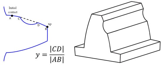 An illustration of the simulated pitting fault. (Left)—quantitative definition of the fault size as the ratio between the fault length and the contact length . (Right)—an isometric view of the pitted tooth. Reproduced from Ref. [].