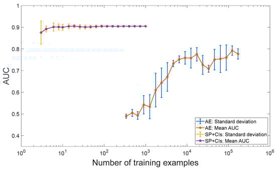 As depicted in Figure 12, the performance of the traditional algorithm quickly stabilizes and reaches an AUC slightly above 0.9 with only around 20 examples. On the other hand, the AE demonstrates an initial improvement, starting from an AUC of approximately 0.5 (which is equivalent to random guessing) and reaching an AUC near 0.75, as expected due to the increase in the number of examples. However, the AE’s performance remains significantly lower than that of the traditional algorithm. This example demonstrates that even with a large amount of data, the deep learning approach is still unable to surpass the performance of the traditional algorithm.