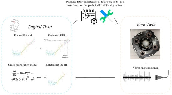 The digital twin uses the measured vibration data to calculate a health indicator through signal processing algorithms that extract features related to spall severity and statistical calculations. Then, the digital twin employs a crack propagation model based on Paris’s law to estimate the current state of the fault and predict its progression. Using a prediction algorithm, the RUL is estimated. Figure 13 illustrates the DT process, which consists of the following steps: