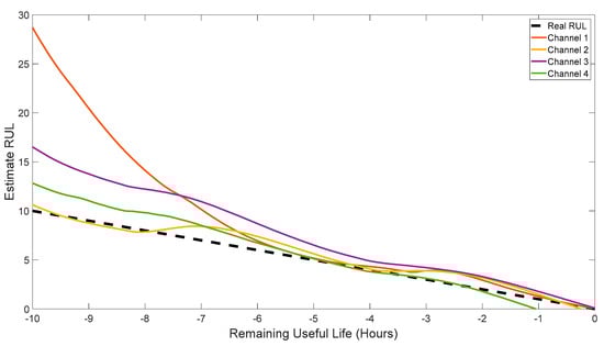 Figure 14 depicts the real RUL and the estimated RUL using the digital twin for all four channels. The dataset comprised 526 acquisitions for each channel, equivalent to 26.25 h of accelerated life testing (with a record taken every three minutes). Earlier in the run, there is little measured degradation, so that is small and the RUL is large. As the fault propagates, the RUL decreases and approaches the of (e.g., for each hour of life run, one hour of component life is consumed). The plot from 10 h until 0 h reflects the point where the digital twin’s estimate or RUL has converged and is providing good data. From a maintenance perspective, this allows operators/maintainers to marshal resources (order a gearbox, tools, the required skill set needed to perform the maintenance) and to schedule that maintenance. Unscheduled maintenance results in missing income, and for a helicopter, could potentially lead to a mishap. Another benefit of removing the gearbox from operations prior to failure is a lower cost of repair. From the figure, it is evident that the new digital twin is highly effective in estimating the RUL across all channels, and the accuracy of the estimation improves as the remaining time approaches 5 h and below. Note that this is an aggressive, accelerated test. In many real-world applications, with a much longer operational life, the digital twin may be able to provide an RUL prediction of 150 to 700 h.