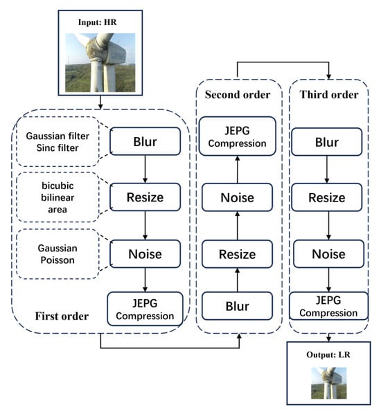 In comparison to previous super-resolution reconstruction methods, we have developed a novel approach by first constructing a third-order degradation model for electrical equipment images. This model simulates the real degradation process, thus producing low-resolution images that closely resemble actual degradation. The process flow is illustrated in Figure 2 and comprises four phases: blurring, stochastic scaling, noise addition, and JPEG compression. The blurring phase encompasses Gaussian and sinc blurring methods, while the stochastic scaling phase includes bicubic, bilinear, and area scaling techniques. Furthermore, the noise addition phase introduces Gaussian and Poisson noise types. Degradation kernels for these processes are randomly selected and applied in multiple iterations to mimic real-world conditions.