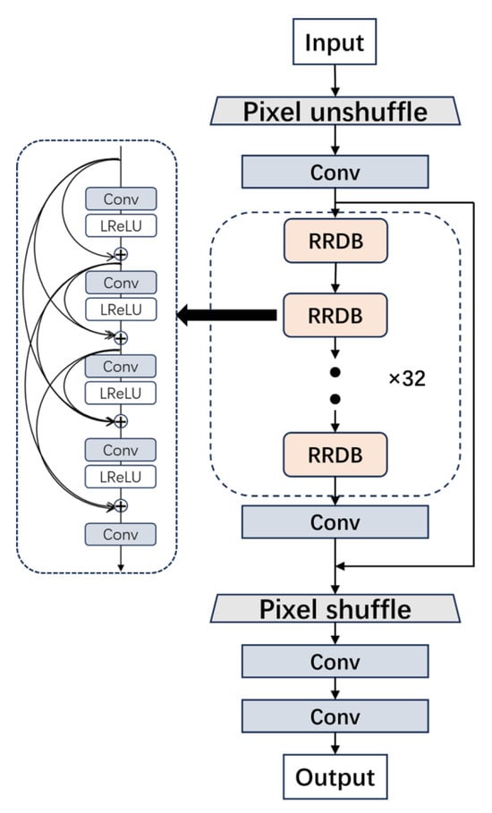 The generator of the super-resolution reconstruction network includes a two-pixel module, four convolutional layers, and a residual dense module group. The Residual-in-Residual Dense Block (RRDB), consisting of 32 residual-in-residual dense blocks, is used to obtain deeper and more complex structures. Each RRDB comprises five convolutional layers and four LeakyReLU activation function layers, with a convolution kernel size of 3 × 3. To better preserve details and enhance image clarity and quality, traditional upsampling and downsampling layers are replaced with Pixel shuffle and Pixel unshuffle methods. This modification improves the performance of the super-resolution reconstruction network. The generator structure is shown in Figure 3.