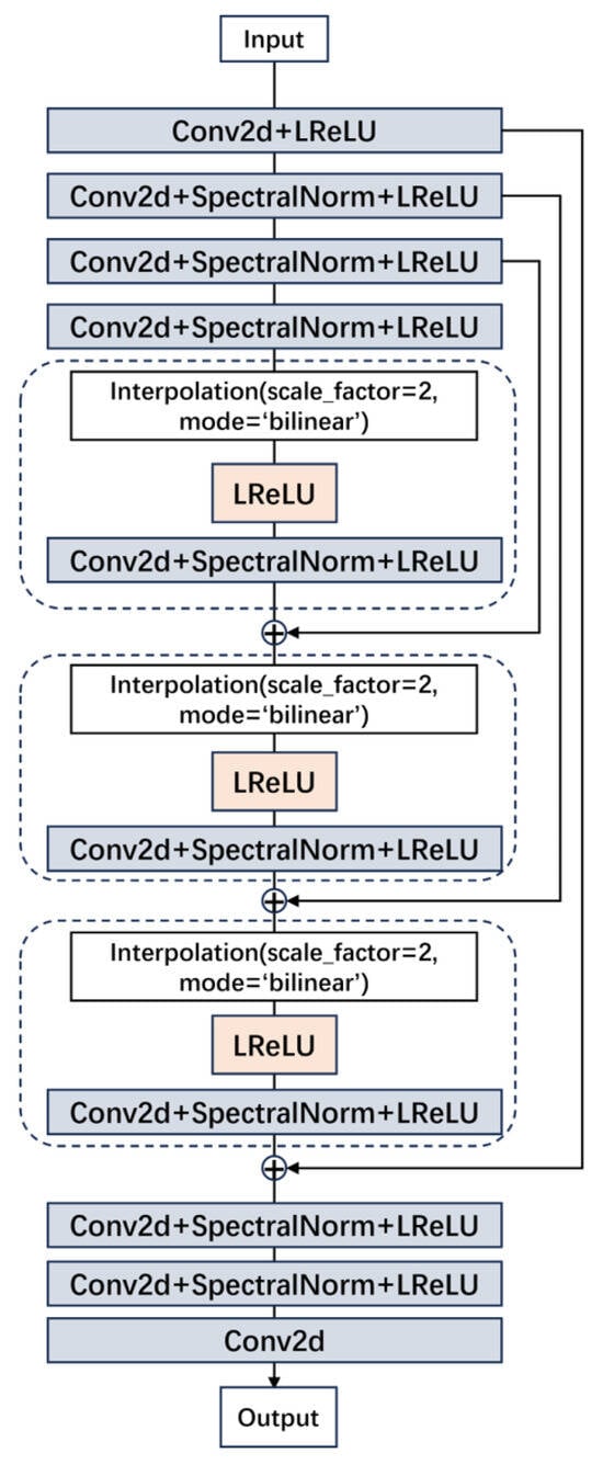 In the discriminator of the super-resolution reconstruction network, like Wang et al. [37], we adopted the U-Net discriminator containing spectral normalization, which includes a downsampling module, three upsampling modules, and an output module. The downsampling module includes a convolution layer and three layers of convolution with spectral normalization, and the upsampling module includes a bilinear interpolation, a LeakyReLU activation function layer, and a convolution layer with spectral normalization. The output module includes two layers of convolution with spectral normalization and a convolution output layer. By adopting this discriminator, the network’s ability to process complex image data is further enhanced, and the training stability and model generalization ability are also improved. The structure is shown in Figure 4.