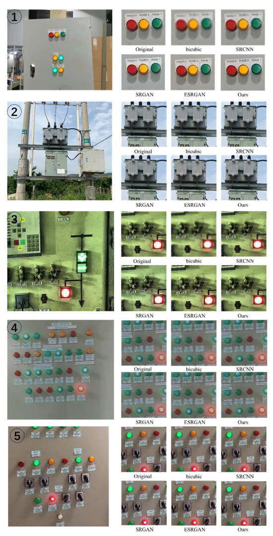 To further enhance the resolution of electrical equipment images and augment the detailed information within them, we employed an improved super-resolution reconstruction method. This method is designed to refine electrical equipment images through advanced algorithms and techniques, thus resulting in a significant improvement in the clarity and resolution of the images. In Figure 7, we compare our method with other super-resolution reconstruction methods, which include SRCNN, SRGAN, and ESRGAN [40]. Moreover, to facilitate a quantitative comparison between different methods, we constructed a dataset containing 15,000 noisy image samples, thereby focusing on substation equipment such as power panels, control boxes, and transformers. During the dataset construction, the blurred images were caused by camera shake and poor lighting conditions. All images were captured using an 8-megapixel camera under consistent settings, with a shooting distance of 3 to 5 m and automatic adjustment of the camera’s focus. For evaluation metrics, we selected the peak signal-to-noise ratio (PSNR), structural similarity (SSIM), and natural image quality evaluator (NIQE) [41], and the comparison results are shown in Table 1.
