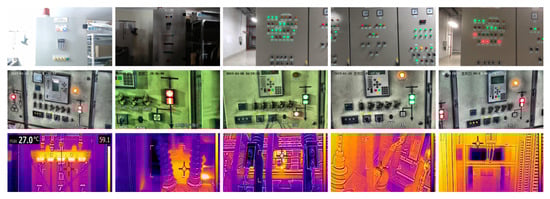 Due to the wide distribution and complex states of electrical equipment, relying solely on manual inspection methods is insufficient to meet the development needs of the power system. An intelligent inspection strategy can leverage machine vision to quickly obtain the thermal state or pixel-level information of electrical equipment [3] and then extract the operational state of the electrical equipment using deep learning-based methods [4,5]. However, several challenges exist in acquiring state information or fault characteristics of electrical equipment through machine vision. First, machine vision technology requires high-precision images to accurately recognize the fault characteristics of electrical equipment. However, the complex structure of electrical equipment, with its various irregular shapes and surface textures, increases the difficulty of image processing and feature extraction. Secondly, electrical equipment typically operates in challenging environments, such as high temperature, high pressure, and high humidity. These environmental factors can degrade image quality through blurring and noise, thus affecting the performance of the machine vision system [6]. Additionally, changes in lighting conditions can create further difficulties in image acquisition and processing [7]. All these factors present significant challenges to the stability and reliability of machine vision-based fault diagnosis algorithms.