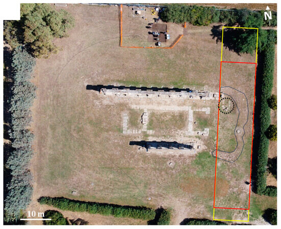 Archaeological site of Metaponto. Aerial image of the Hera temple with the yellow and red box indicating, respectively, the areas covered by ground and UAV magnetic datasets. The dotted circle highlights an outcropping calcarenite structure forming a relic at the base of the eastern temple side. The blue line encloses an area corresponding to a subtle change in vegetation, as discussed in the text.