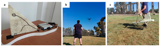 MFAM configurations used in the surveys. (a) Geometrics MFAM “Development kit” arrangement inside the prototype bird with the additional frame, which allows the sensors to be separated; (b) UAV flight configuration; (c) Ground configuration.