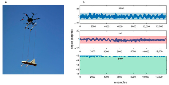 In the case of wind (as it was at the time of the survey), the choice of suspending the magnetometer using 3 m long ropes can create unwanted oscillations in the sensors, which could compromise both the stability of the flight and the data quality. To overcome these problems, we improved the stability of the flight configuration by adding a wooden support that widened both the suspended magnetometer support base and the distance between anchor points at the base of the drone (Figure 3a). We checked the pitch, roll, and yaw data (Figure 3), representative of the three principal axes of rotation of the system during flight, collected along some test lines and observed that all the points fall in the magnetometer attitude variations recommended by [32] (±5° yaw, ±10° pitch, and roll).