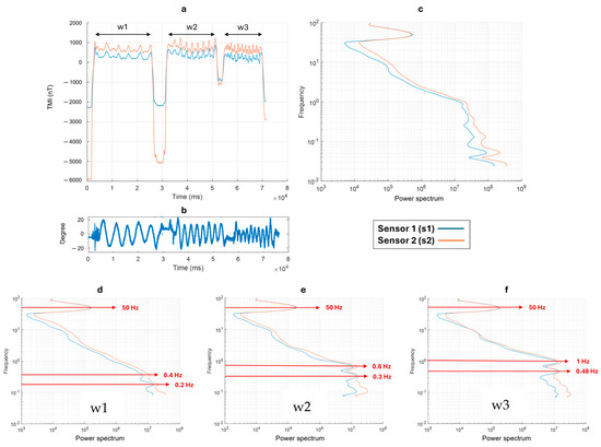 Figure 4a shows the TMI variation in the magnetic data in the time domain during the first test (pitch). The orange (s2) and blue (s1) lines indicate, respectively, the signals of sensor 2 (the sensor closer to the ground) and sensor 1. We can distinguish three moments of different swinging motion frequency: (1) the time window 1 (w1) between 2.5 s and 37 s; (2) the time window 1 (w2) between 47 s and 77 s; (3) the time window 1 (w3) between 89 s and 112 s. The oscillation frequency increases from w1 to w3. The pitch data variations relative to the TMI measurements are shown in Figure 4b. During the highest frequency test (time window w3), we can see that the oscillations exceeded +/−20°. We obtained a scalogram of the datasets in the time domain by the continuous wavelet transform (CWT), using the “Morse wavelet” ([36]). From this scalogram, we obtained the power spectrum by summing the power of each single frequency at all times. We present the power spectrum in Figure 4c, which summarizes the spectral content of the entire dataset and for each time window (w1, w2, and w3), as shown in Figure 4d–f, respectively. Spectral analysis allows for the identification of several spectral contributions to the field. The prominent peak around 50 Hz is a common feature that can be interpreted as the contribution of the electrical power lines present in the area. The contributions due to the swinging motion are identified in w1 (Figure 4d) at 0.2 Hz (with a very small amplitude) and 0.55 Hz. As expected, in w2 and w3 (when the oscillation frequency increases), the two peaks are at higher frequencies, 0.5 Hz and 1 Hz, and 0.75 Hz and 1.5 Hz, respectively. We noticed that by increasing the oscillation frequency from w1 to w3, the amplitudes of the frequency peaks measured at the two magnetometer sensors (s1 and s2) became similar.