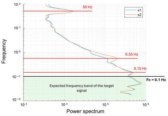Power spectrum of UAV magnetic data. The blue and orange lines are referred to, respectively, the first and second sensor signals. The red lines indicate the mean noise peaks: (1) 50 Hz relative to the power lines; (2) 0.55 Hz and 0.15 Hz are interpreted as generated by the oscillations of the system. The cyan area, at frequencies lower than 0.1 Hz, highlights the frequency band associated with the target signal that will be used as the cut-off frequency for low-pass filtering of the noisy components at 50, 0.55 and 0.15 Hz.