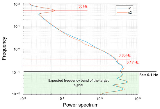 Power spectrum of the ground data. The blue and orange lines are referred to, respectively, the first and second sensor signals. The red lines indicate the mean noise peaks: (1) 50 Hz relative to the power lines; (2) 0.35 Hz and 0.17 Hz are due to the oscillation of the system. The cyan area is associated with the target signal at frequencies lower than 0.1 Hz that is used as the cut-off frequency for the low-pass filtering of the dataset.