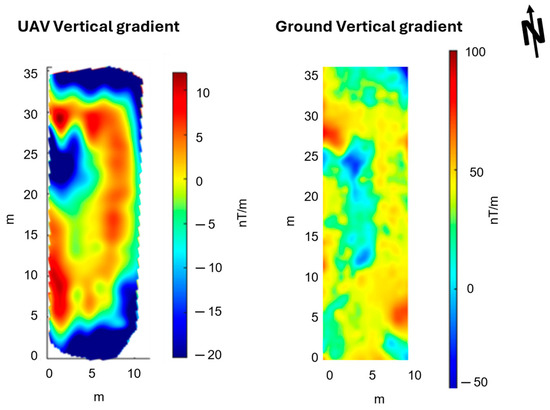 Side-by-side comparison of the vertical gradient maps obtained from drone-borne (on the left) and ground (on the right) datasets.