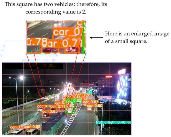 where E is a logical expression. The schematic diagram is as Figure 2. The significance of this formula is that it first divides the image into several rectangular squares at equal distances and then counts how many vehicles are in each small square.