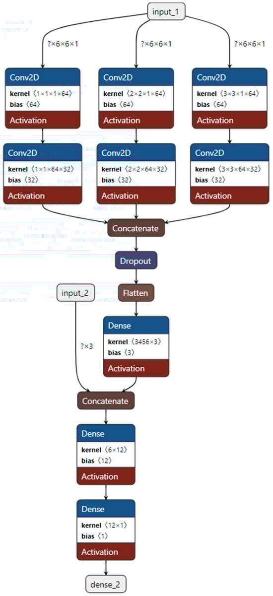 In order to capture the features of different sizes of the image, the image first passes through 3 convolution branches respectively. The convolution kernel sizes in the three branches are 1, 2, and 3 respectively. The padding is set to the same. That is to say, the size of the feature map is always m*m. First, in each of the three branches, the image passes through a convolutional layer, a ReLU layer, a convolutional layer, and a ReLU layer. Then, the features extracted from the three branches are concatenated together. The concatenated feature map passes through a dropout layer, a flattening layer, and finally a fully connected layer with an output length of 3 to obtain the vector representation of our image. The inference formula for the convolutional neural network part of the classifier is as follows: