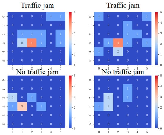 This article extracts a feature map based on the vehicle position information obtained by the target detection model and uses it for the final classification model. We divide the entire image into m*m squares. In this experiment, we set the parameter m = 6. The reason why we determined m = 6 is that we conducted 5-fold cross-validation on the training set, and m = 6 can produce a relatively optimal result. In Section 3.8, we will discuss the value of m in detail. Then count the number of vehicles in each square. Finally, the feature map is used as the input of the classification model. Figure 8 shows the feature map extraction results of four images. The categories of the upper two images are traffic congestion, and the categories of the lower two images are non-congestion categories.