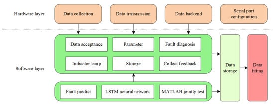 The software layer divides the system function modules and builds the fault diagnosis subsystem and the fault prediction subsystem. By receiving the data transmitted by the hardware layer and adjusting the parameter range of the front panel of the host computer, the system program control of the rear panel determines whether they are fault data, and the indicator light changes depending on whether the data are faulty. In the fault prediction part, the LSTM neural network prediction model is built, and LabVIEW and MATLAB are jointly debugged to train the model on the historical data time series set to realize the prediction of the data.