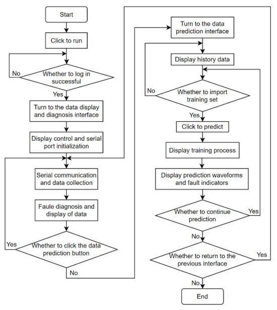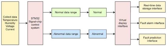The system block diagram is shown in Figure 2. Using an STM32 single-chip microcomputer (China) as the core, the fault detection and prediction first collect the data and clarify the parameter range. Then, the single-chip microcomputer system analyzes the collected data, judges whether the data are within the normal range, converts the data within the parameter range into a text signal of “normal” or “fault”, transmits the data to the virtual reality panel of the host computer, collects data multiple times for each transmission, and realizes the fault diagnosis and prediction of the system hardware design.
