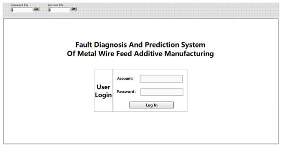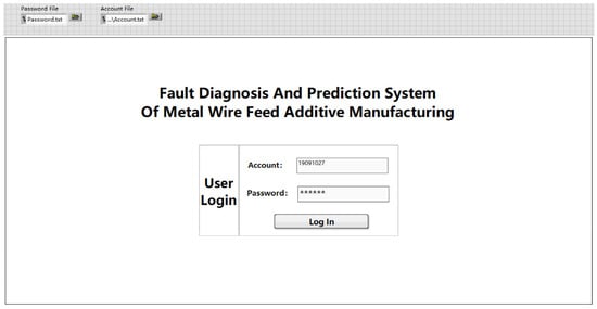 Open the LabVIEW system and import the password file in the user login module in the upper left corner of the file into the following path: C:\Users\25741\Desktop\Fault Prediction 1.3\Fault Diagnosis and Prediction 1.3\Password.txt. Import the account file into the path C:\Users\25741\Desktop\Fault Prediction 1.3\Fault Diagnosis and Prediction 1.3\Account.txt. Select Start Running Program, enter the login page of the metal wire feeding additive manufacturing fault diagnosis and prediction system, enter the default account, 19091027, and the default password, 123456, and click Login to successfully log into the system. The login page can operate normally, as shown in Figure 10.