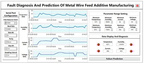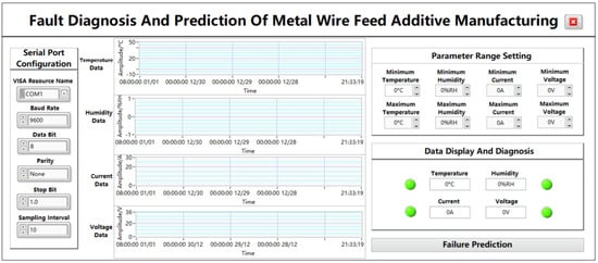 The system is designed using the LabVIEW platform to realize the functions of data acquisition, data processing, LSTM neural network model construction, fault diagnosis, and prediction. The data acquisition module is mainly implemented using the sensor module in LabVIEW, which can collect various parameter data in the metal wire feeding additive manufacturing process in real time. The data processing module is mainly implemented through the data processing module in LabVIEW. The LSTM neural network model’s building blocks are mainly implemented using the neural network modules in LabVIEW, including the building, training, and testing of LSTM neural network models. The fault diagnosis and prediction module is mainly implemented through the human–machine interface module in LabVIEW, which can display the diagnosis and prediction results in a graphical way.