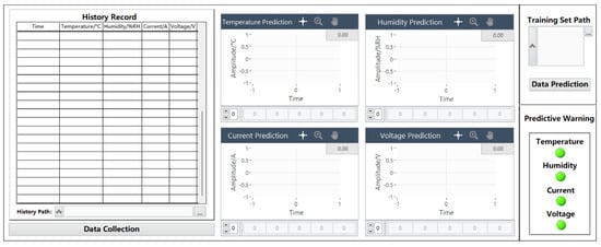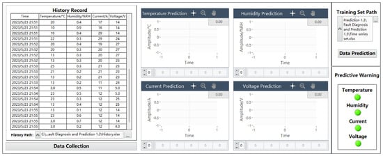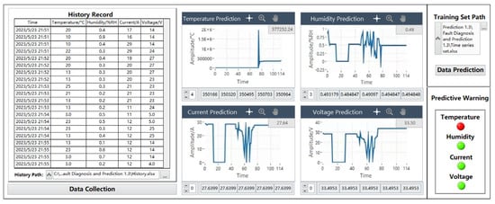 The history module mainly comprises importing an Excel 2019 sheet control to record the data of the data collection and display panel. When the received data are within the normal range, the system will automatically save the normal data value of the current time node, and when any of the four parameters are not within the normal range, the history will not save the data. The initial interface does not display the specific path. Users can change the historical data record path at the bottom of the table according to their needs. The default historical path is C:\Users\25741\Desktop\Fault Prediction 1.3\Fault Diagnosis and Prediction 1.3\History.xlsx. The module can save 5 types of parameters, such as time, temperature, humidity, current, and voltage, at one time. The temperature range is −10–50 °C, the humidity range is 0–100%RH, the current range is 0–30 A, and the voltage range is 0–36 V. Among them, time accuracy includes the year, month, day, and minute, temperature accuracy is ±0.5 °C, humidity accuracy is ±2%, current measurement accuracy is ±0.1 A, and voltage measurement accuracy is ±1 V.