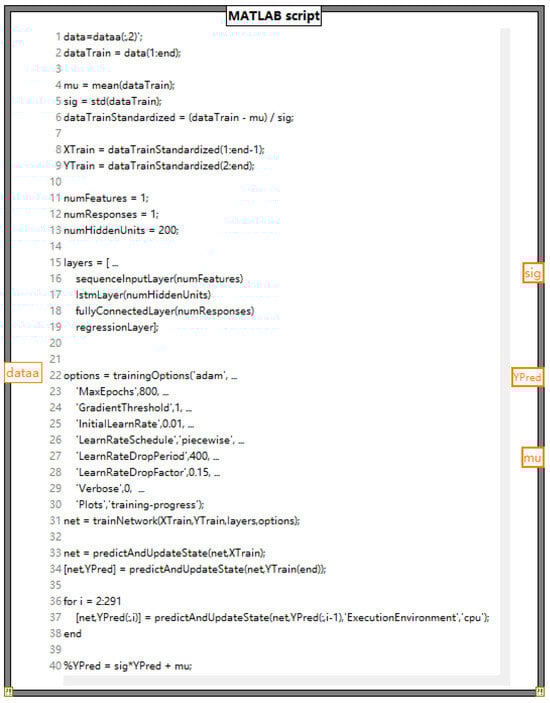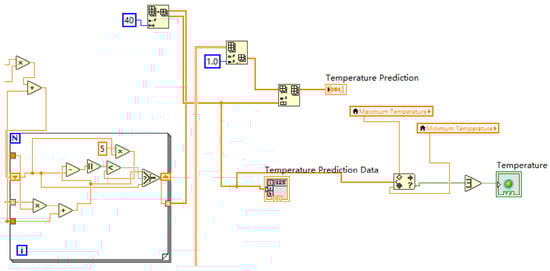 The data processing and prediction module analyzes and extracts the data received on the serial port simulator, carries out data preprocessing, and realizes data display, fault diagnosis, historical data recording, and data display through the selection and effective connection of various controls. Fault prediction and other functions, in which the data prediction function needs to be implemented in conjunction with MATLAB, establish a MATLAB program window in the program panel and write the neural network prediction toolbox program in MATLAB, where data are the program input function and YPred is the function to realize the prediction. A program box can predict the data of one parameter, and four program boxes need to be designed in this design to predict the predicted data values of four parameters: temperature, humidity, current, and voltage. The specific program diagram is shown in Figure 8.