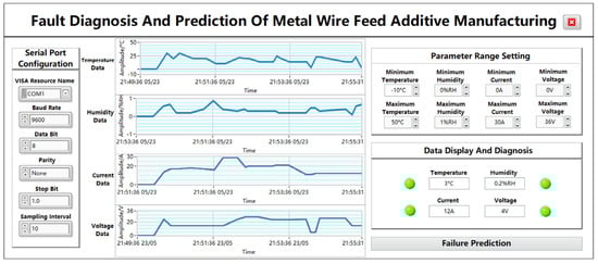 To test the fault diagnosis function of the system, the temperature is set to 60 °C, the humidity is set to 1.6%RH, the current is set to 40 A, and the voltage is set to 40 V through the serial port simulator, and it is sent to the host computer, as shown in Figure 13. In the real-time data display, this set of data is accurately displayed as temperature 60 °C, humidity 1.6%RH, current 40 A, and voltage 40 V, and the waveform diagram module can also be displayed normally. If the transmitted temperature, humidity, current, and voltage data are outside of the normal range of parameters, the indicator alarm state is triggered, the four indicators are jumped from the initial state of “green” to “red”, and the fault display and diagnosis module can display the data normally.