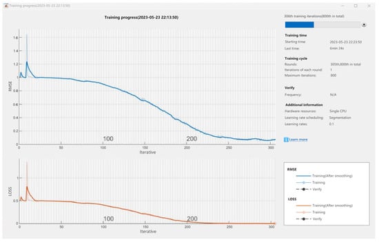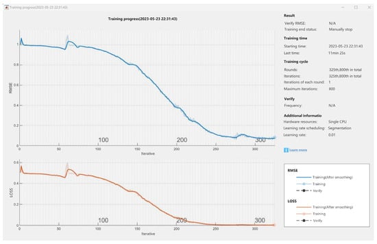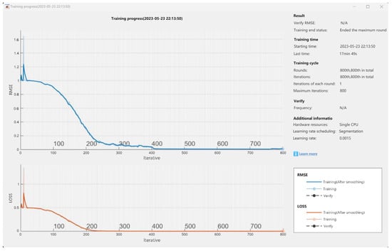 As shown in Figure 15, when the system is trained on a computer with a processor of 12th Gen Intel(R) Core(TM) i5-12500H (Intel, Santa Clara, CA, USA), the training progress of one of the parameters takes a total of 17 min and 49 s from automatic iteration to the end, and the training end state is the maximum number of rounds completed, while the start time is 23 May 2023. At 22:13:50, the number of iterations in each round is 1, the maximum number of iterations is 800, the RMSE curve is in a decreasing state, the peak value is about 1.25, the loss curve is in a decreasing state, and the peak is about 0.8.