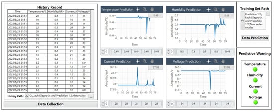 When there is an abnormality in the prediction data, the abnormal parameters can be clearly observed from the prediction alarm module, and the number of significant digits in the data display can also be changed according to the demand. The significant digits are reserved for six digits in this prediction. As can be seen from the graph, the waveform of the temperature prediction data graph is significantly different from the waveform of other parameter data, and its peak value is far beyond the set range. The humidity varies roughly between 0%RH and 1%RH, the current varies between 0 A and 30 A, and the voltage varies between 0 V and 32 V. The temperature prediction alarm indicator at the prediction alarm module jumps from “green” to “red” in the initial state, indicating that the temperature parameter may have abnormal data in the predicted data of 40 nodes. This is consistent with the consequences that may result from manually stopping the temperature parameter training iteration before, as the specific prediction data below the waveform are displayed normally, and the indicator can display the prediction alarm information. The specific test diagram is shown in Figure 17.