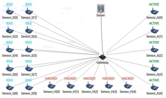 • Hacked Sensors (HS): Controlled by the attacker, these bots are present only during the attack scenario, where they disrupt the network using Internet Control Message Protocol (ICMP) flood attacks with an intensity of 4 Mbps.