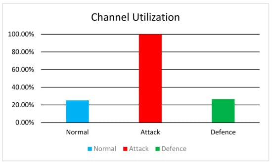 In the normal scenario, channel utilization is measured at 25.23%, indicating moderate network activity. However, during the attack scenario, the channel utilization peaks at 100%, suggesting severe congestion because of the flooding attack. Notably, during the defense scenario, we observe a decrease in channel utilization to 26.55%, representing a 73.45% reduction from the Attack scenario. This reduction suggests that the TDIP defence mechanism effectively mitigates the impact of the attack, allowing for improved network performance and reduced congestion.